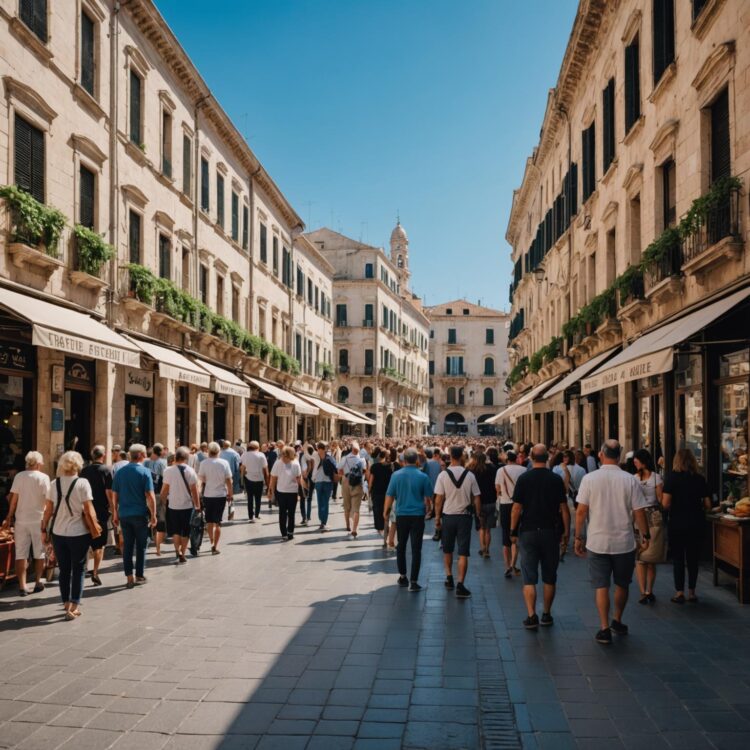 - Zatłoczone place i ulice handlowe (via Sparano, Corso Cavour, okolice Teatro Petruzzelli)